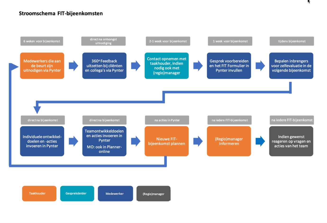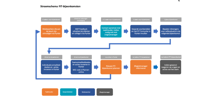Iedere twee jaar start een nieuwe FIT-ronde. Deze FIT-rondes bestaan uit zoveel FIT-bijeenkomsten dat iedere individuele medewerker zijn/haar inbreng heeft. In de praktijk ziet dat eruit als in onderstaand schema.