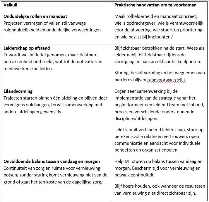 - Valkuil: onvoldoende balans tussen vandaag en morgen. Continuïteit van zorg en ruimte voor vernieuwing botsen; zonder sturing komt vernieuwing niet van de grond of gaat het ten koste van de dagelijkse zorg.